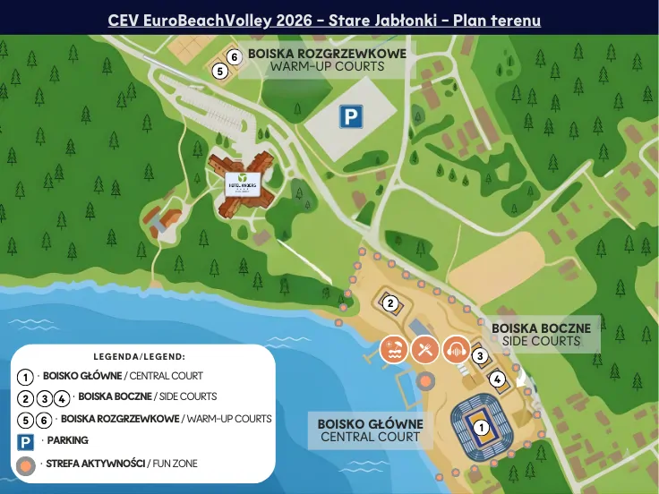 Na czas wydarzenia powstanie główny stadion na 5 000 miejsc. Obok niego trzy boiska boczne i dwa rozgrzewkowe. To profesjonalna arena od lat przyciągająca najważniejsze turnieje w Polsce i na świecie. Miejsce z duszą — łączy mazurską naturę, świetną organizację i pasję do siatkówki plażowej obecną tu od ponad dwóch dekad.